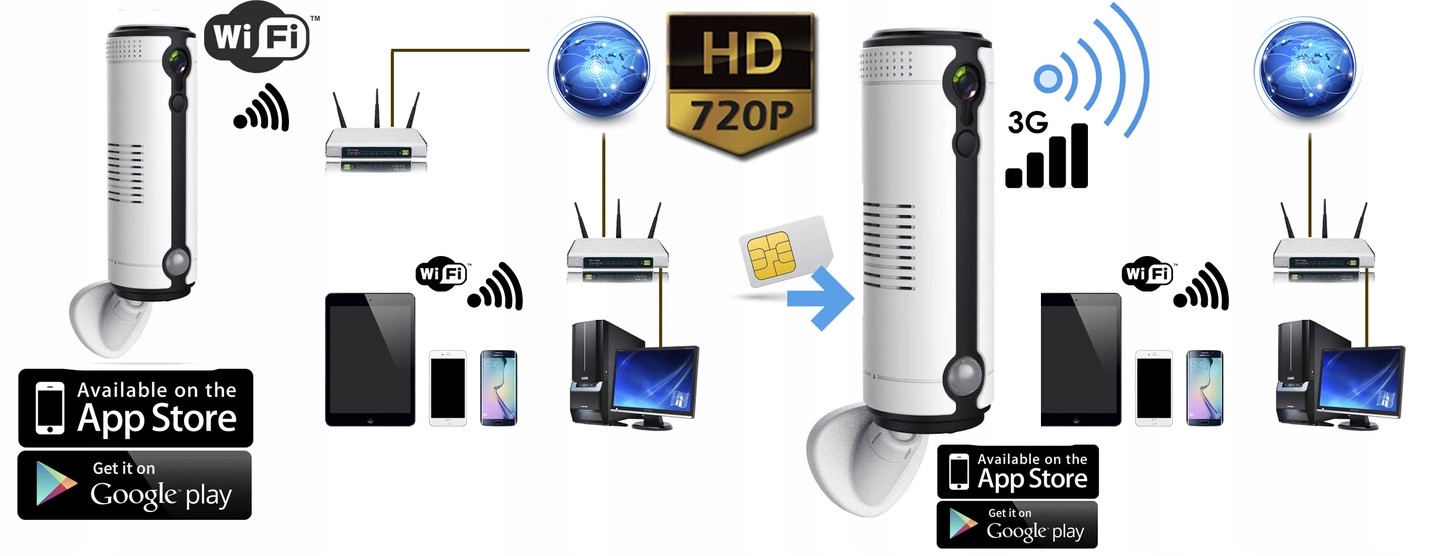 - Kamera działa przez WIFI i przy użyciu karty SIM przez 3G GSM