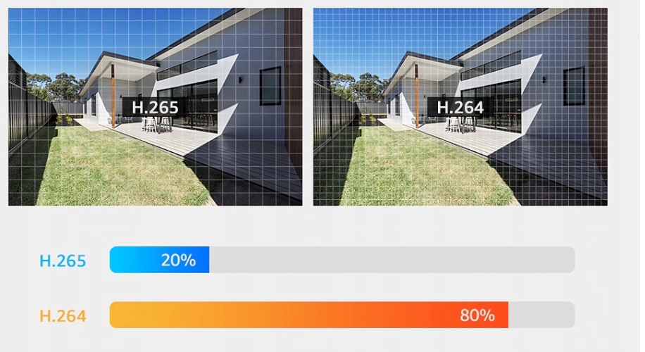 Kamera przyjmuje zaawansowaną kompresję H.265, zmniejsza rozmiar pliku 50% i zachowuje tę samą jakość w porównaniu do kamery h.264.