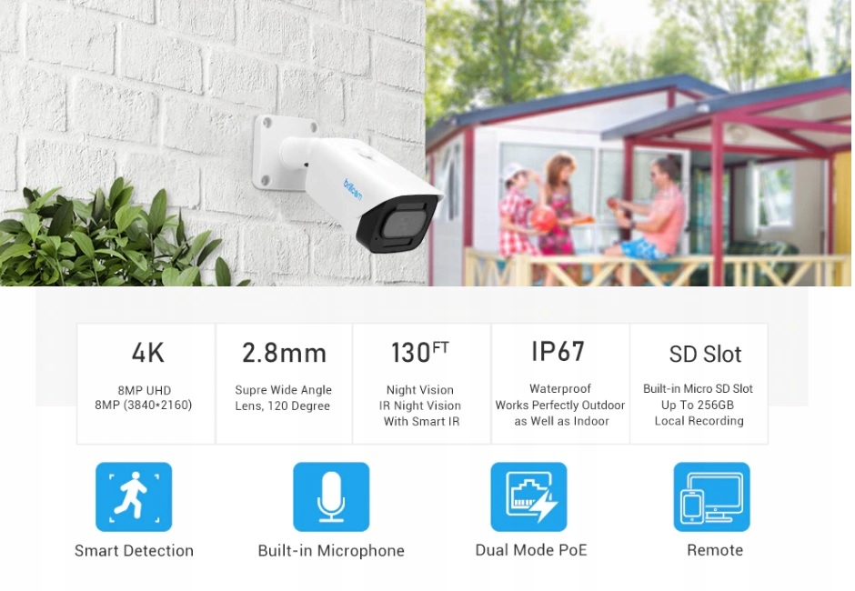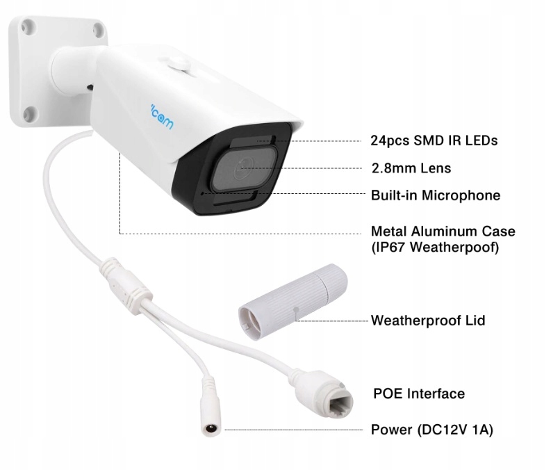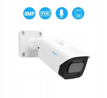 Kamera 4K IP o wysokiej rozdzielczości 8MPx, należy do kamer sieciowych IP tubowych z zaimplementowanym wysokowydajnym procesorem, posiadającym wiele innowacyjnych rozwiązań mających wpływ na jakość obrazu. Kamera posiada promiennik podczerwieni o zasięgu do 40 m, dzięki któremu możemy prowadzić 24 godzinny monitoring bez ryzyka utraty szczegółowości nadzorowanego obszaru w słabych warunkach oświetleniowych. Kamera ma wbudowany obiektyw o ogniskowej 2,8mm, kąt patrzenia ok 120 stopni, kamera posiada również wbudowany mikrofon .