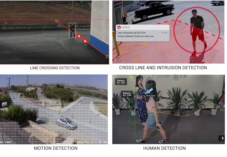 *W przeciwieństwie do normalnego wykrywania ruchu kamera rejestruje zdarzenia „ludzkiego ruchu” i zapisuje dokładnie momenty do późniejszego odtwarzania, zmniejszając znacznie wykrywanie błędów przez ruch. Można ustawić ludzkie wykrywania, linecrossing wykrywania i wykrywania włamań…