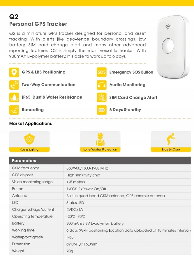 Q2 to miniaturowy przenośny lokalizator GPS przeznaczony do śledzenia osobistego i zasobów. Dzięki alertom, takim jak przejścia graniczne geo-fence, niski poziom naładowania baterii, alert zmiany karty SIM i wiele innych zaawansowanych funkcji raportowania, Q2 to po prostu najbardziej wszechstronny tracker. Z baterią litowo-polimerową 900mAh jest w stanie pracować do 6 dni.