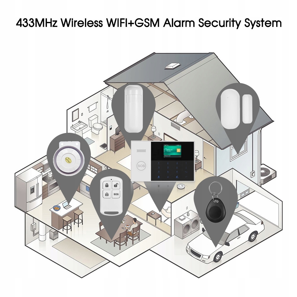 PG-107 ALARM BEZPRZEWODOWY 4 CZUJKI +SYRENA +PILOTY +RFID WiFi GSM SIM