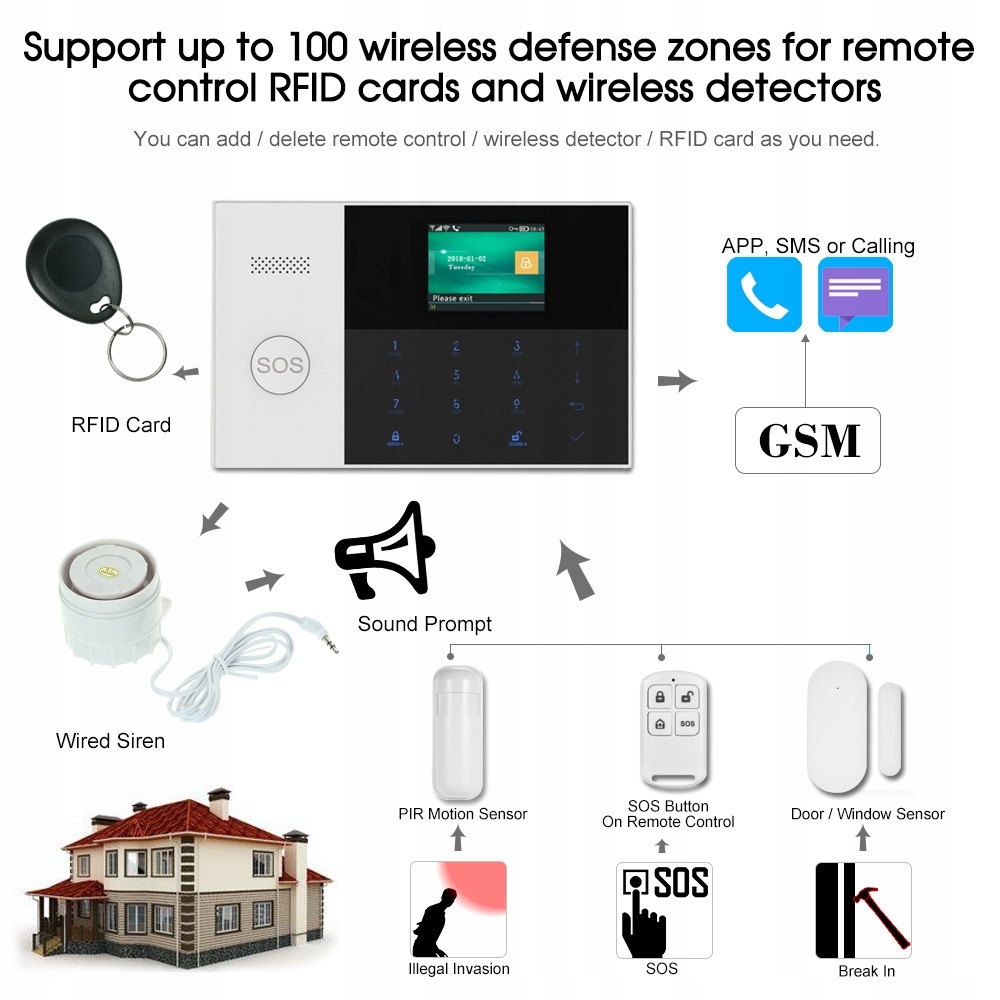 | Defense zone supports | Support gate SOS, bedroom, window, balcony, perimeter, smoke, gas, carbon monoxide, water leaking |
