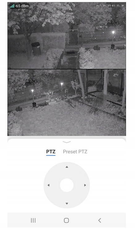 W aplikacji dostępne są 2 ekrany wideo, górny to kamera o stałym położeniu, a dolny to kamera PTZ.